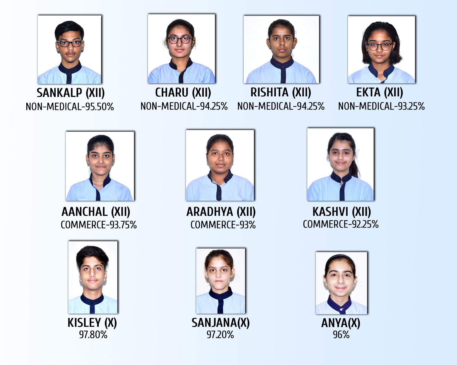 कक्षा बारहवीं के विज्ञान संकाय में विद्यालय के छात्र संकल्प गुप्ता ने 95.50% अंक लेकर प्रथम स्थान प्राप्त कर विद्यालय को गौरवान्वित किया। साथ ही चारु गर्ग और ऋषिता चक्रवर्ती ने 94.25% अंकों के साथ द्वितीय और एकता चौहान ने 93.25% अंक प्राप्त कर विद्यालय में तृतीय स्थान प्राप्त किया है।