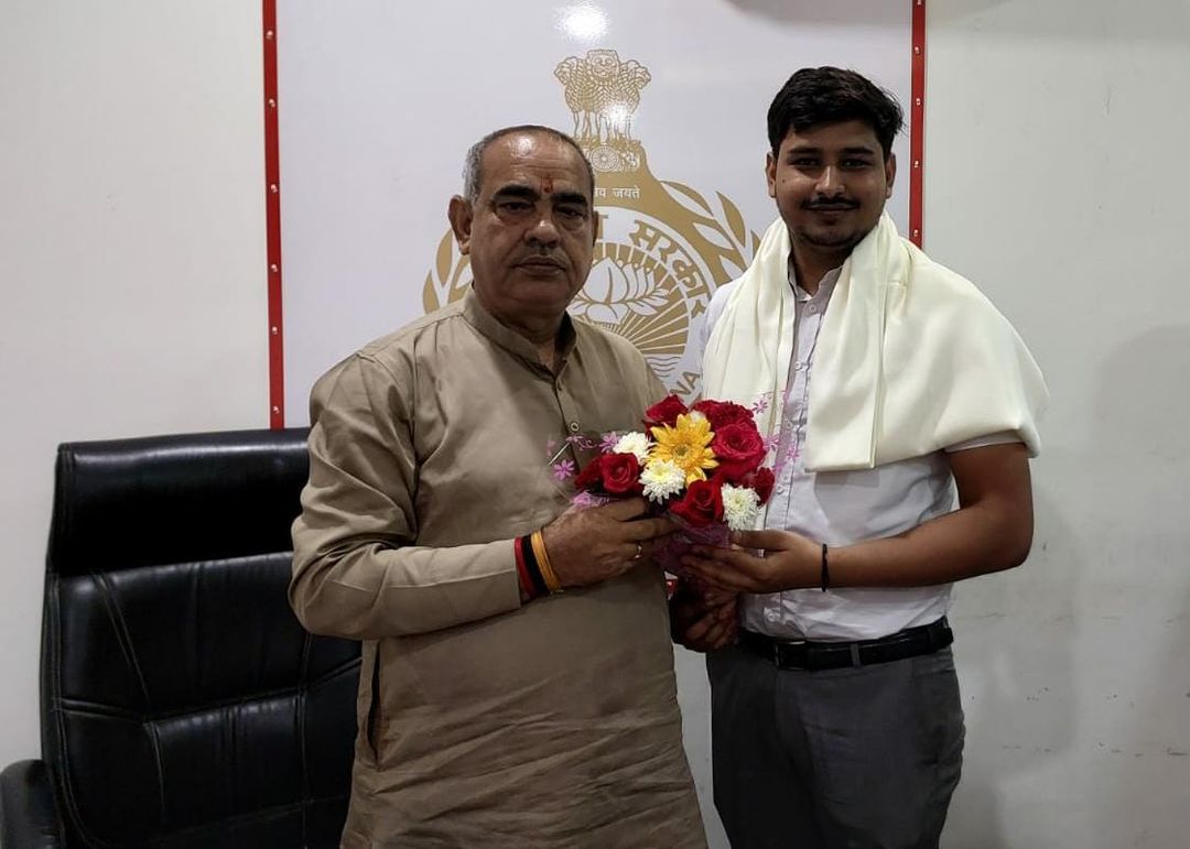 परिवहन मंत्री मूलचंद शर्मा ने चेतन सैणी को शाल ओढ़ाकर सम्मानित किया और मुंह मीठा कराया
